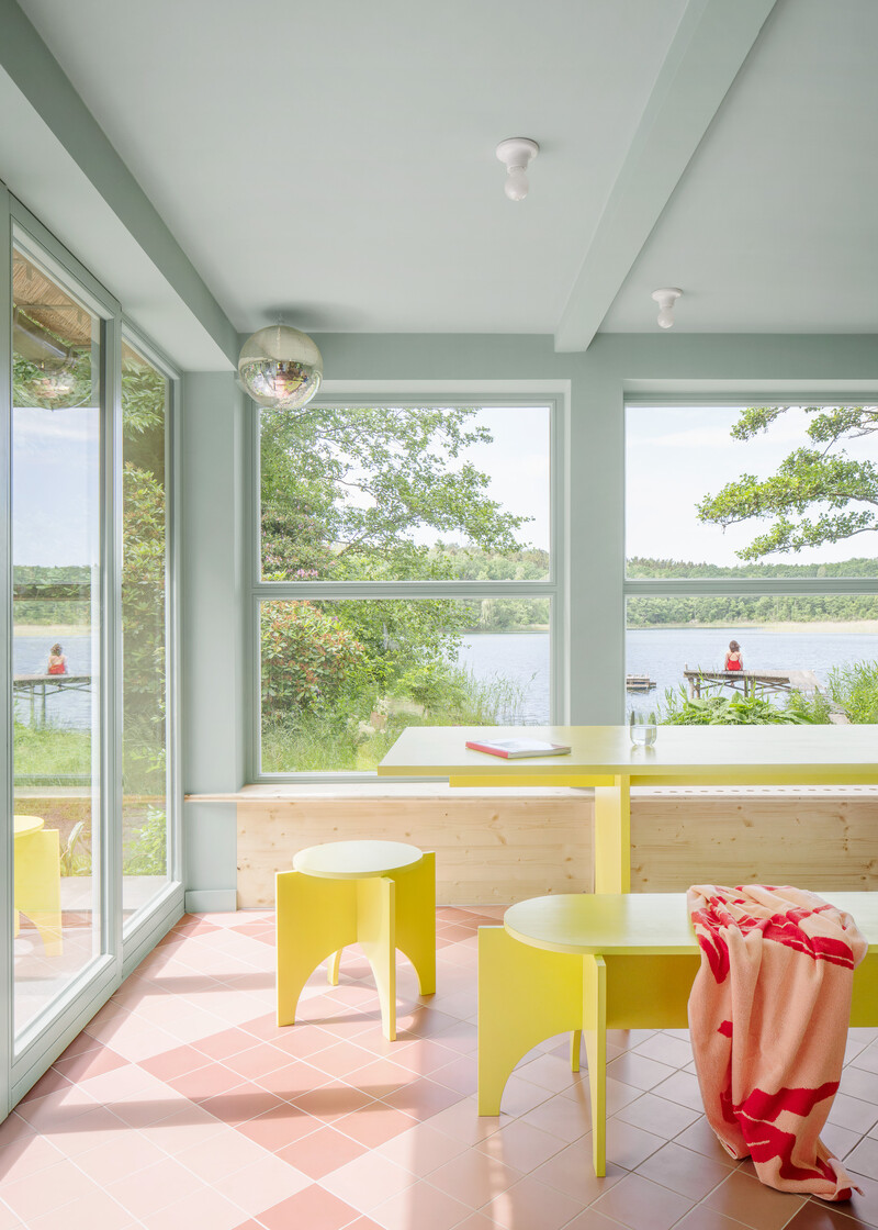 The material palette is reduced: reddish-brown and pink tiles were laid in an oversized chequerboard pattern twisting into the room. The oversized format plays with scale and distorts the perception of space. All fixtures are made in pinewood panels, contrasted by the neon yellow freestanding furniture, designed especially for the cottage and the kitchen handles that quote the same bright colour. Wall and ceiling surfaces, as well as all window frames of the common area are painted in a light green to create expansiveness. The dark green in the bedroom, which appears almost black, blurs the contours of the room and provides a view of the lake.