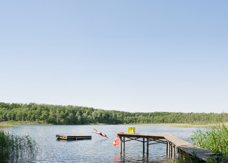 Just before the Baltic Sea coast, accessible only via very sandy and narrow paths, lies a small lake. Hidden behind the trees, a small thatched house stands directly on the shore. Built in 1958 by its namesake, the house now serves as the holiday home Dr. Funk for his grandchildren.
