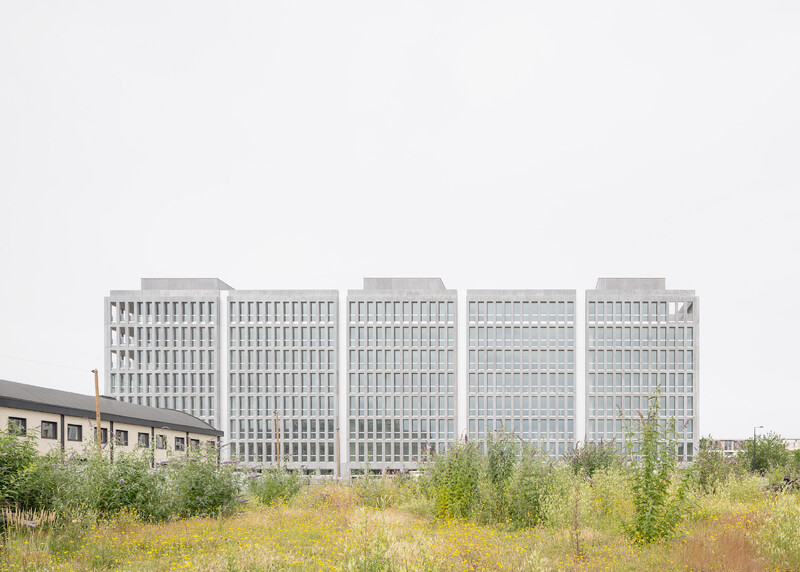 KAAN Architecten’s construction principles for JUMP are based on three key parameters: designing flexible spaces, minimizing building materials, and ensuring robust structures. The façades and cores of the building are designed to be load-bearing without requiring additional support allowing open, column-free interior spaces. To the east, thin prestressed hollow core slabs make it possible to cross the building’s 13-meter width. To the west, three protruding volumes, each 19-meter thick, contain circulation cores in the centre and either workspaces or hotel rooms on the sides.