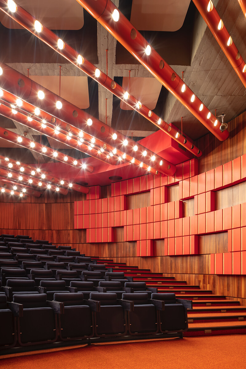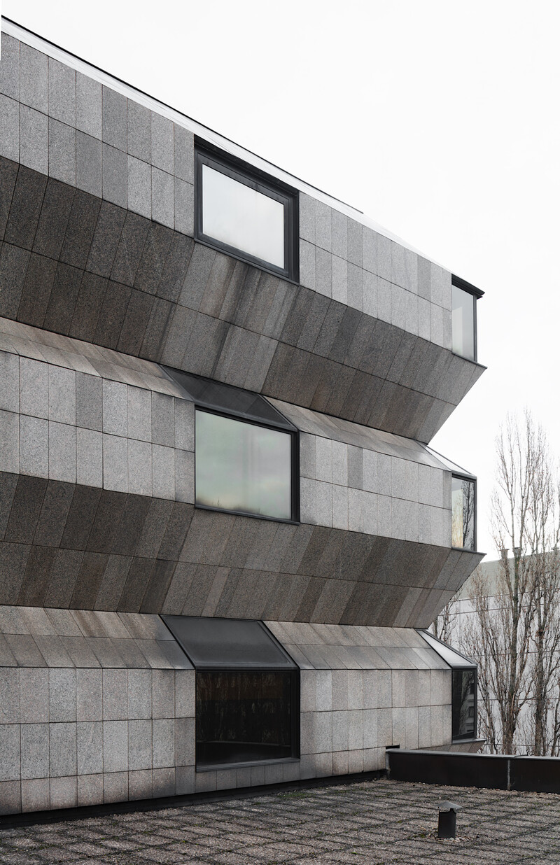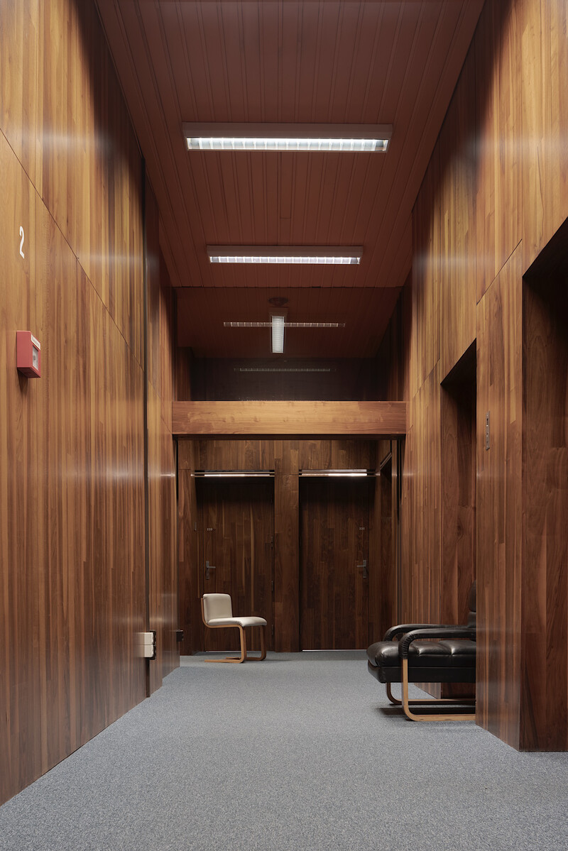 Cutting-edge geometry of the volume creates the self-contained, futuristic appearance of its exterior–formed by granite panel cladding, large tinted windows, horizontal window bands and slanted window parapets. On the first floor, three glass capsules raised above the ground emphasise the distinct outline of the embassy. The exterior stands in stark contrast to the interior design environment–a unique symbiosis of colour, material, and art in architecture designed by the architects that remains largely intact today. The interior bursts with bright orange, red and yellow, suggesting a great sensibility and conscious play with the emotional colour effects one encounters in the work of Verner Panton or Le Corbusier’s art brut paintings.